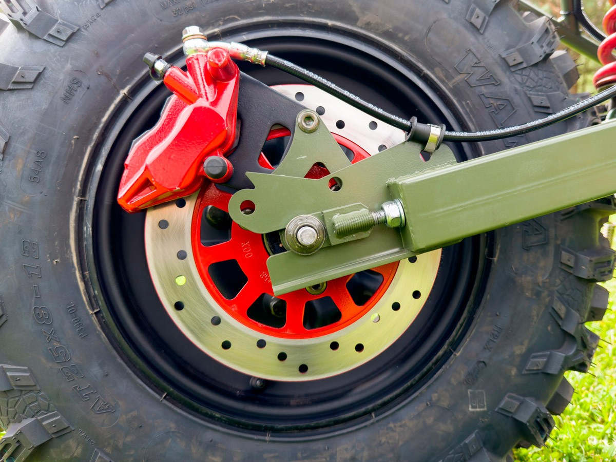 В качестве передних амортизаторов мы использовали перевернутую вилку с большим ходом от мотоциклов Эндуро. Задней подвеской служит моноамортизатор с регулируемым преднатягом пружины.