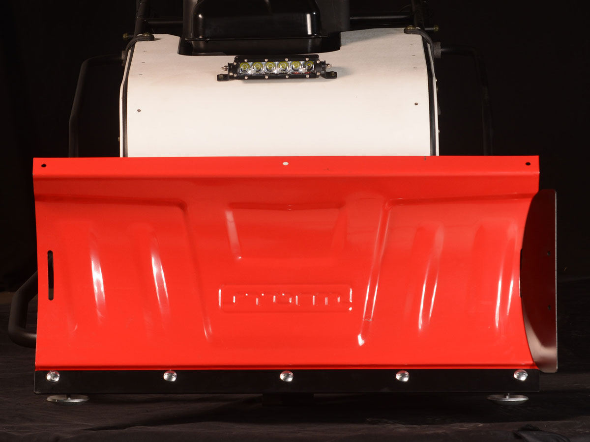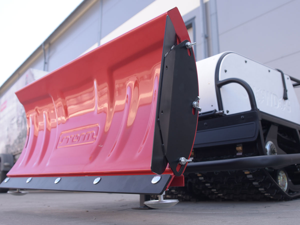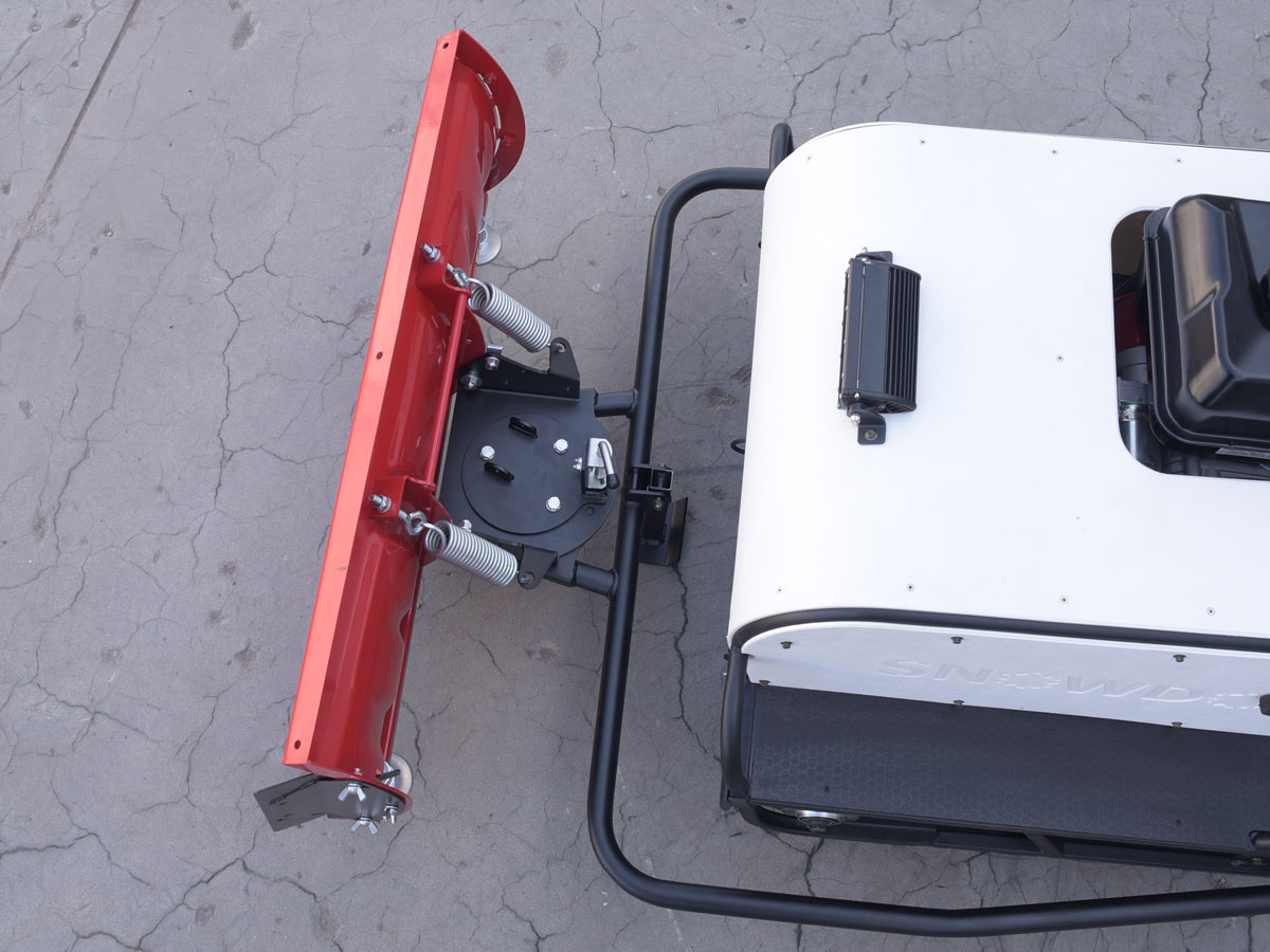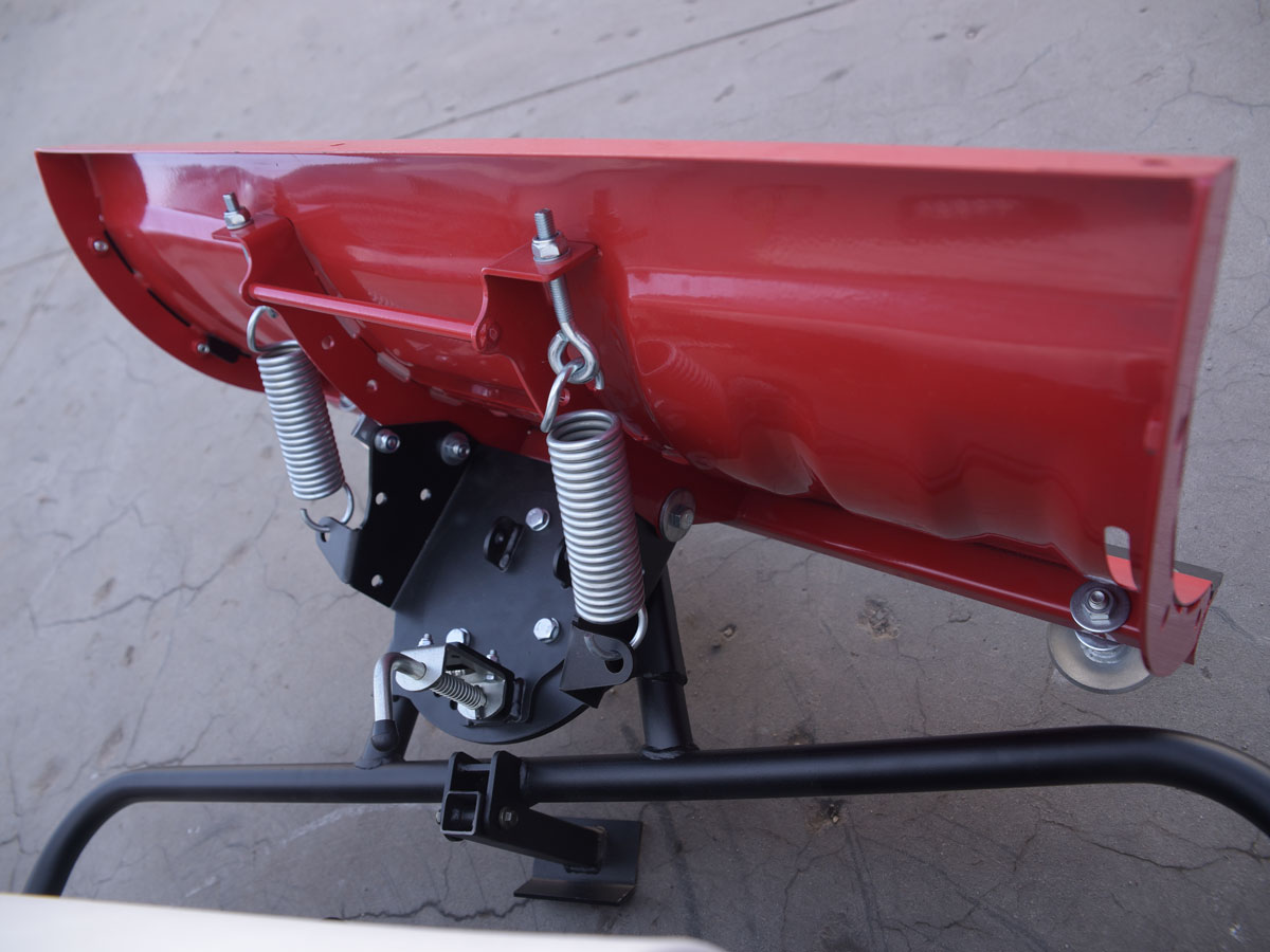 Монтаж и демонтаж занимает совсем немного времени — около 20 минут. Всё устанавливается в штатные крепления рамы. Ширина снегоотвала соответствует ширине буксировщика — 890 мм. Таким образом, личная снегоуборочная машина — вполне реализуемое желание.