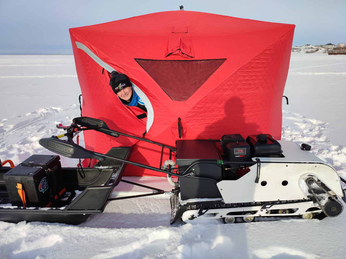 «За 1,5 минуты мы её поставили. И она вполне объёмная. Первые впечатления от неё шикарные… Сегодня ловим окуня и сорогу на глубине около 5 метров на зимний фидер. Очень удобно это делать, сидя в таких условиях».