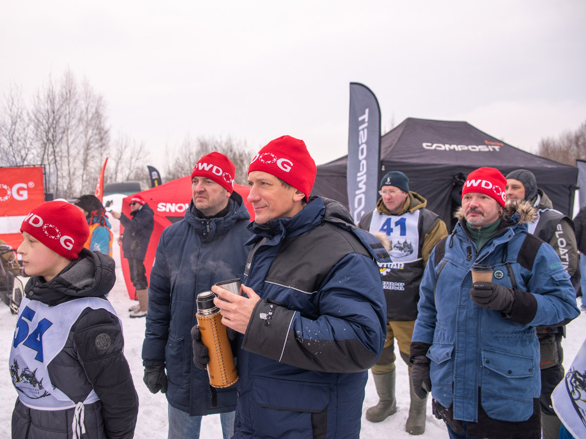 Рядом с нашим «экспо-местом» самопроизвольно сформировалась парковка буксировщиков Barboss и Snowdog. Синие и белые тягачи образовали целый лагерь. Все участники с мотособаками, произведенными нашей компанией, автоматически от нас перед стартом получили фирменные шапки Snowdog. Таким образом, по красной верхушке можно было легко определить «свояка» на трассе издалека.